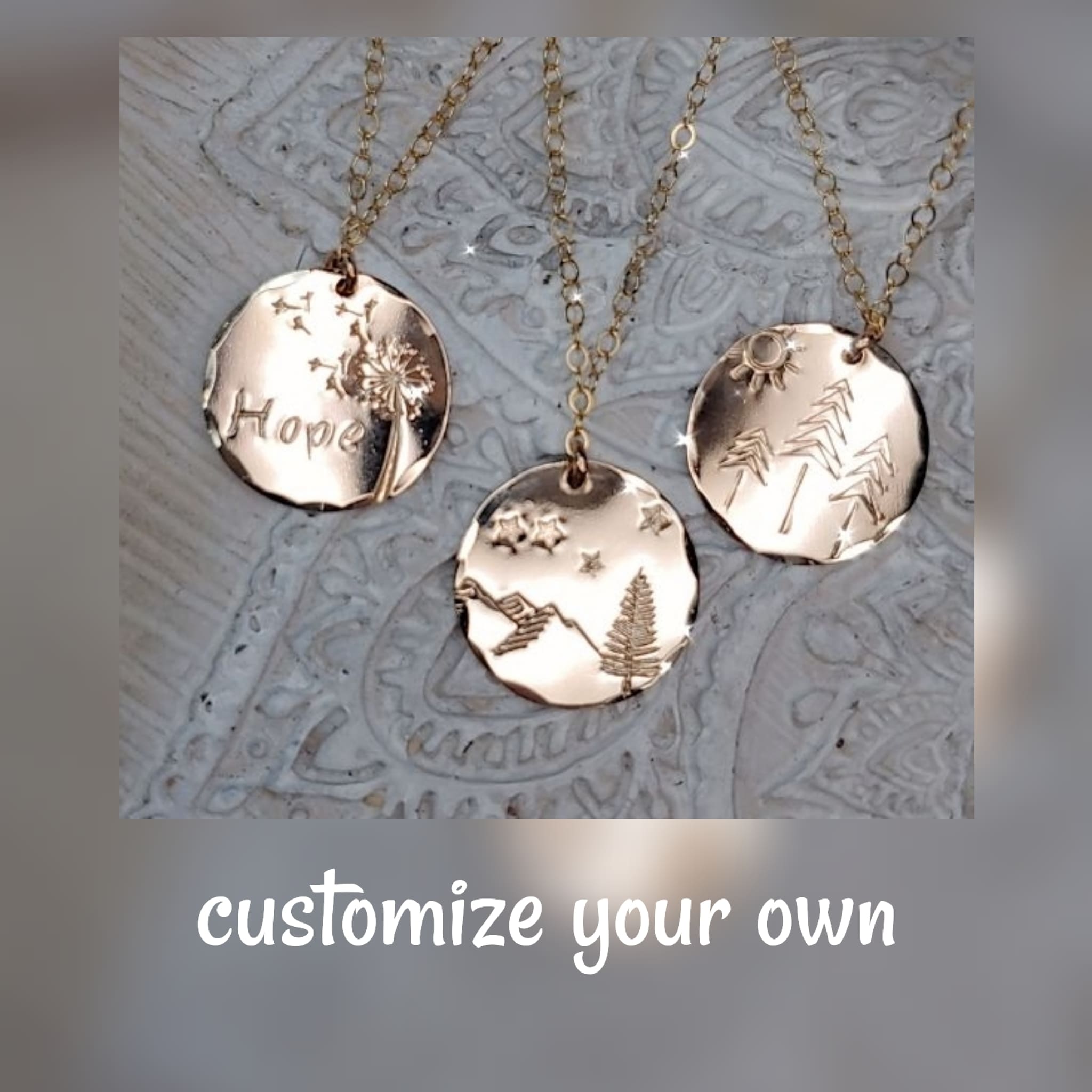 Customize your 16 mm….5/8 inch coin necklace Mention in notes below how you would like your coin made. In the photo you will see how this 5/8 inch coin looks on…..it is layered with the largest 3/4 coin.