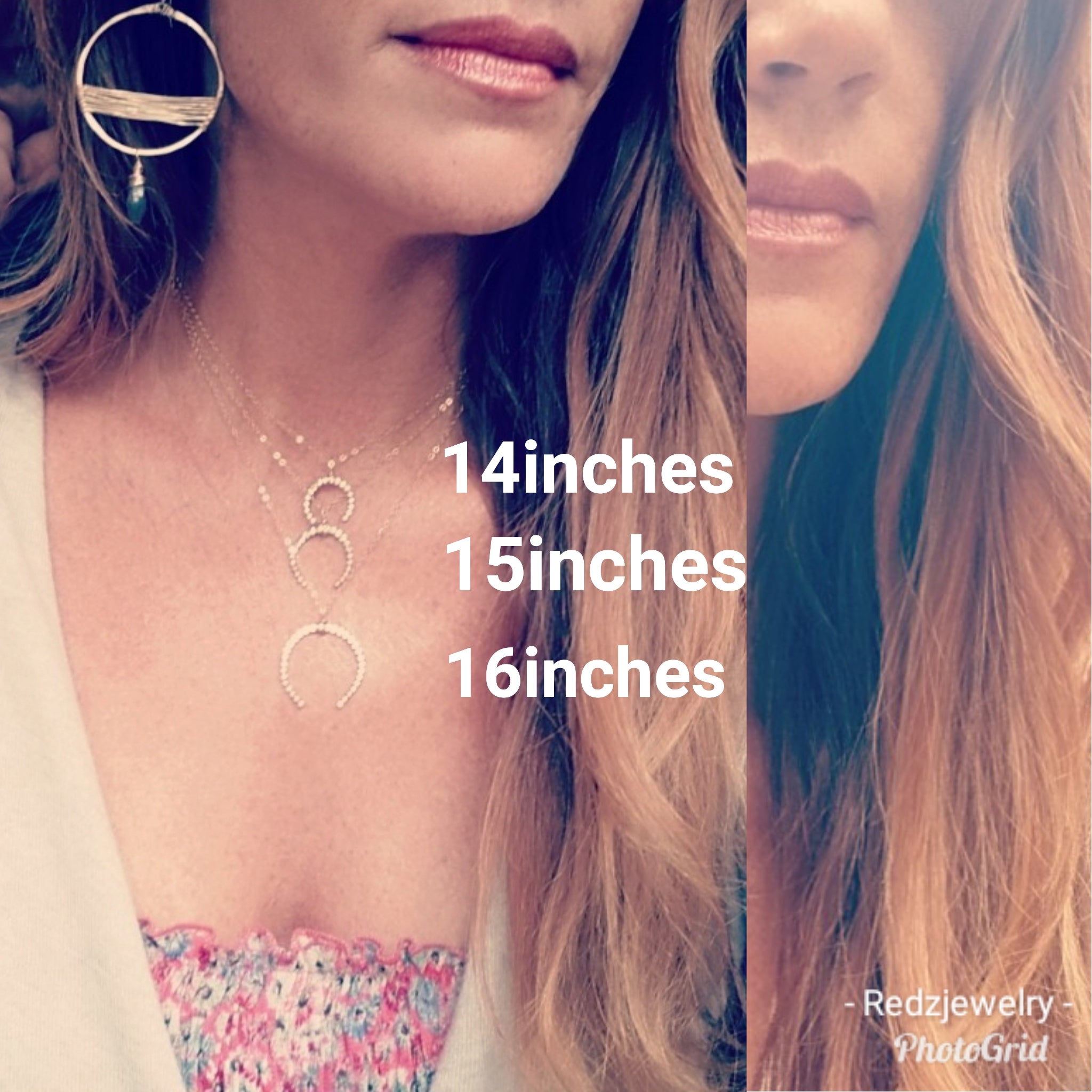 in the photo I am wearing the small crescent at 14inches. The Medium is at 15 inches. and the large is at 16inches.