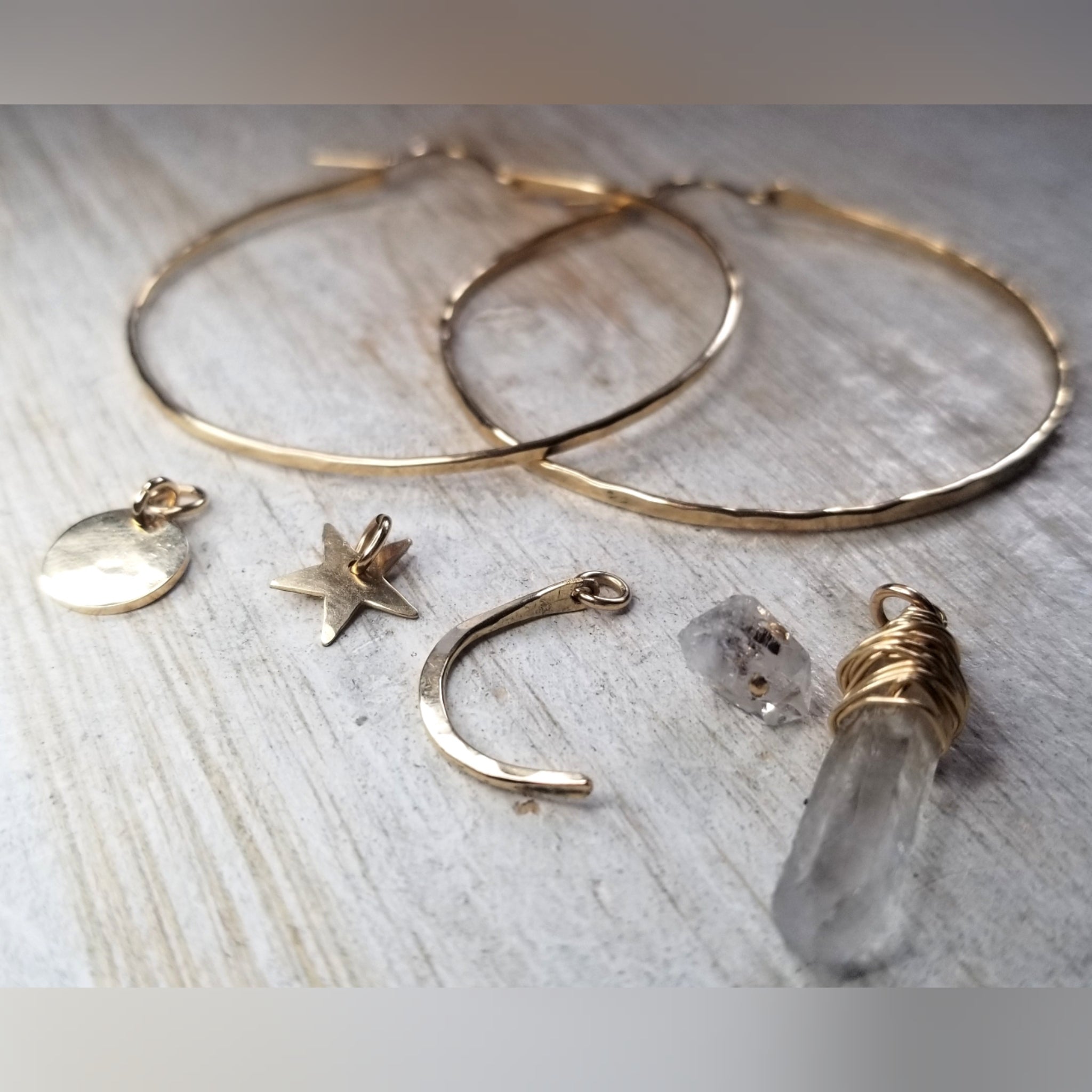 These classic hoops have a lot of options! You can swap out any one of the 5 Charms and wear them each individually or mix and match and wear several together. Easily taken on and off. Wear them any way you like!