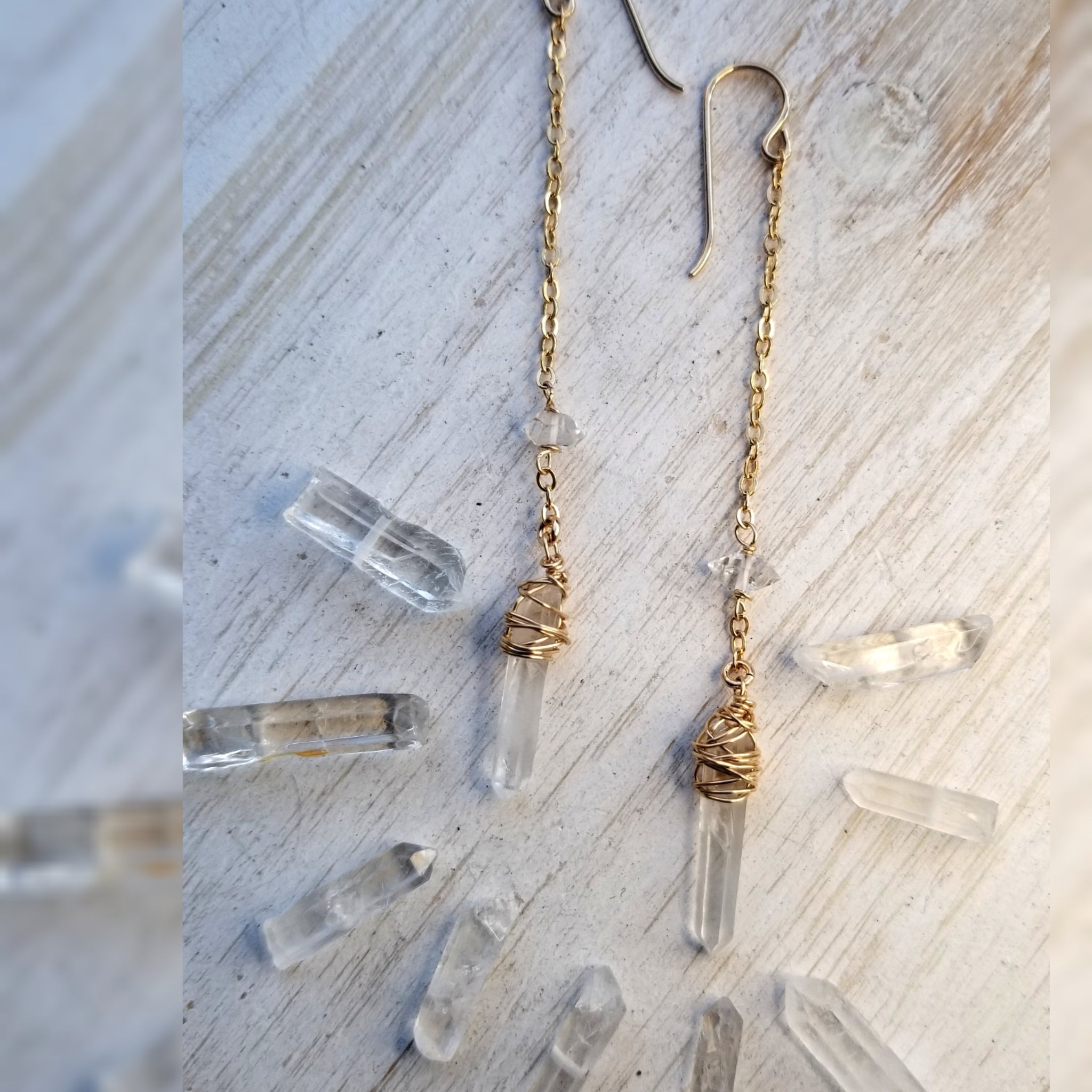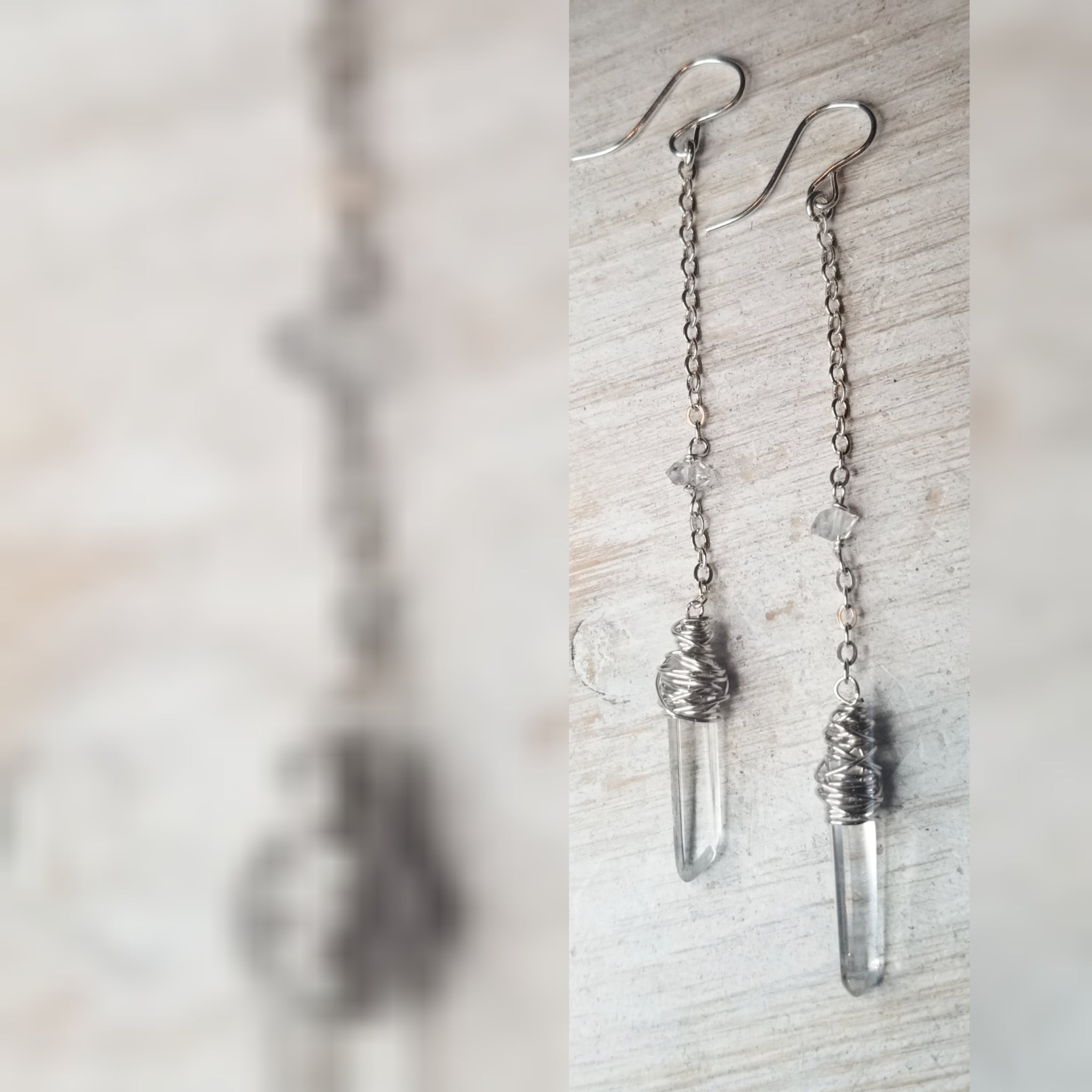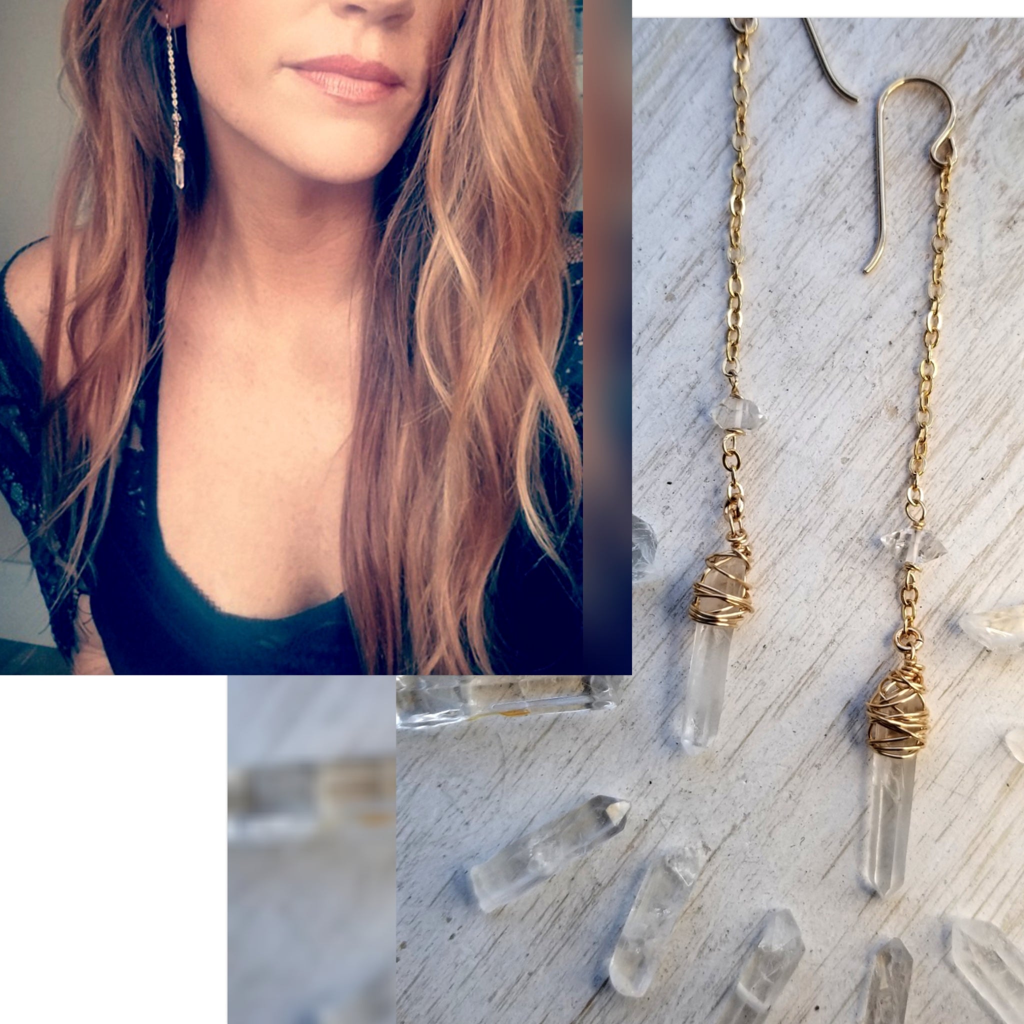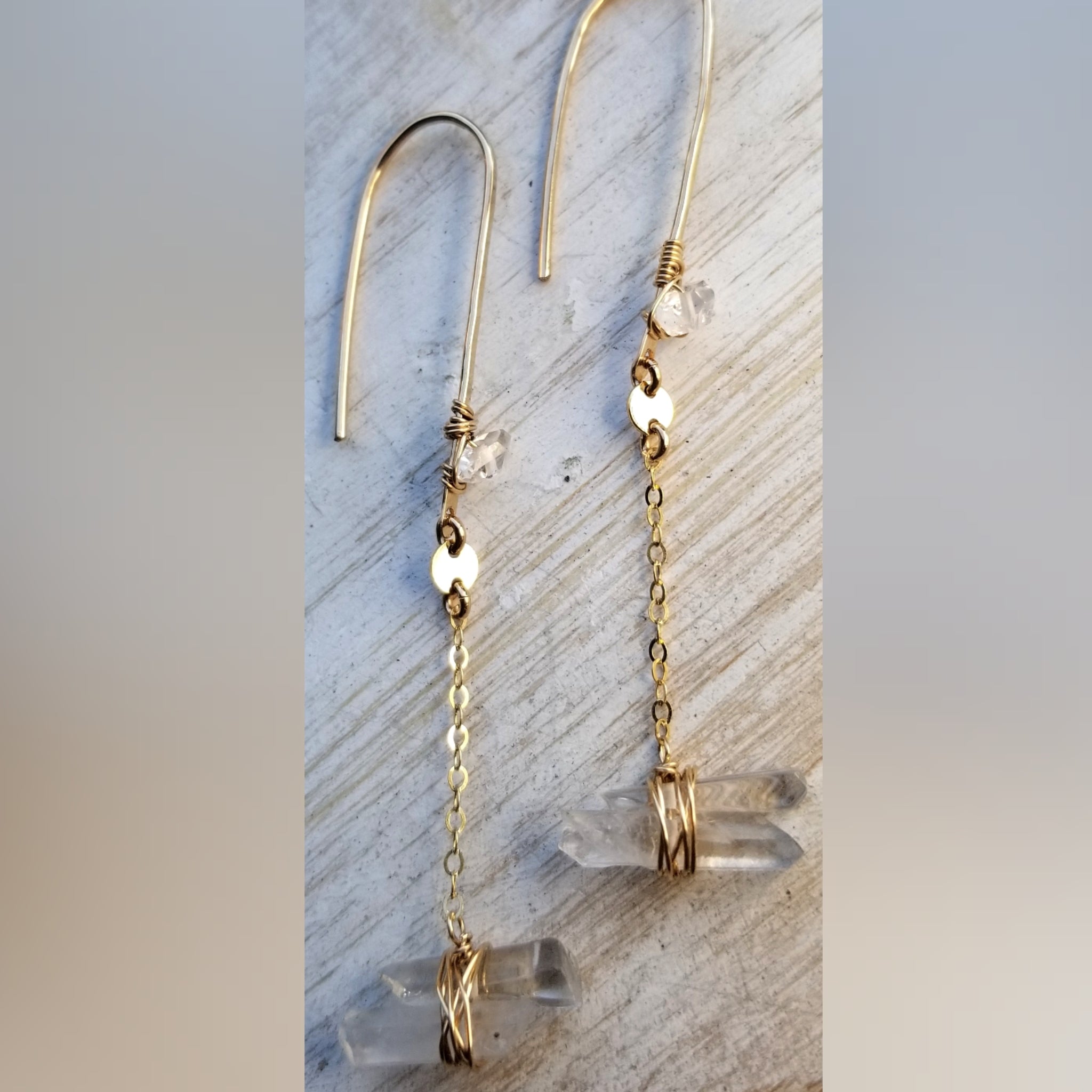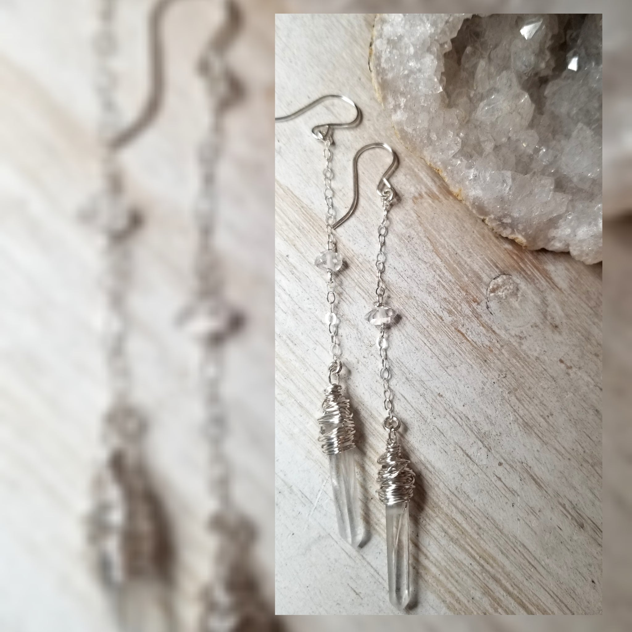 Two simple crystal drop earring designs. One with the single crystal drop & tiny Herkimer Diamond, and the other with 2 crystals wrapped together & a tiny Herkimer Diamond wrapped on the Ear threader style Ear Wire…. Im all about the options!