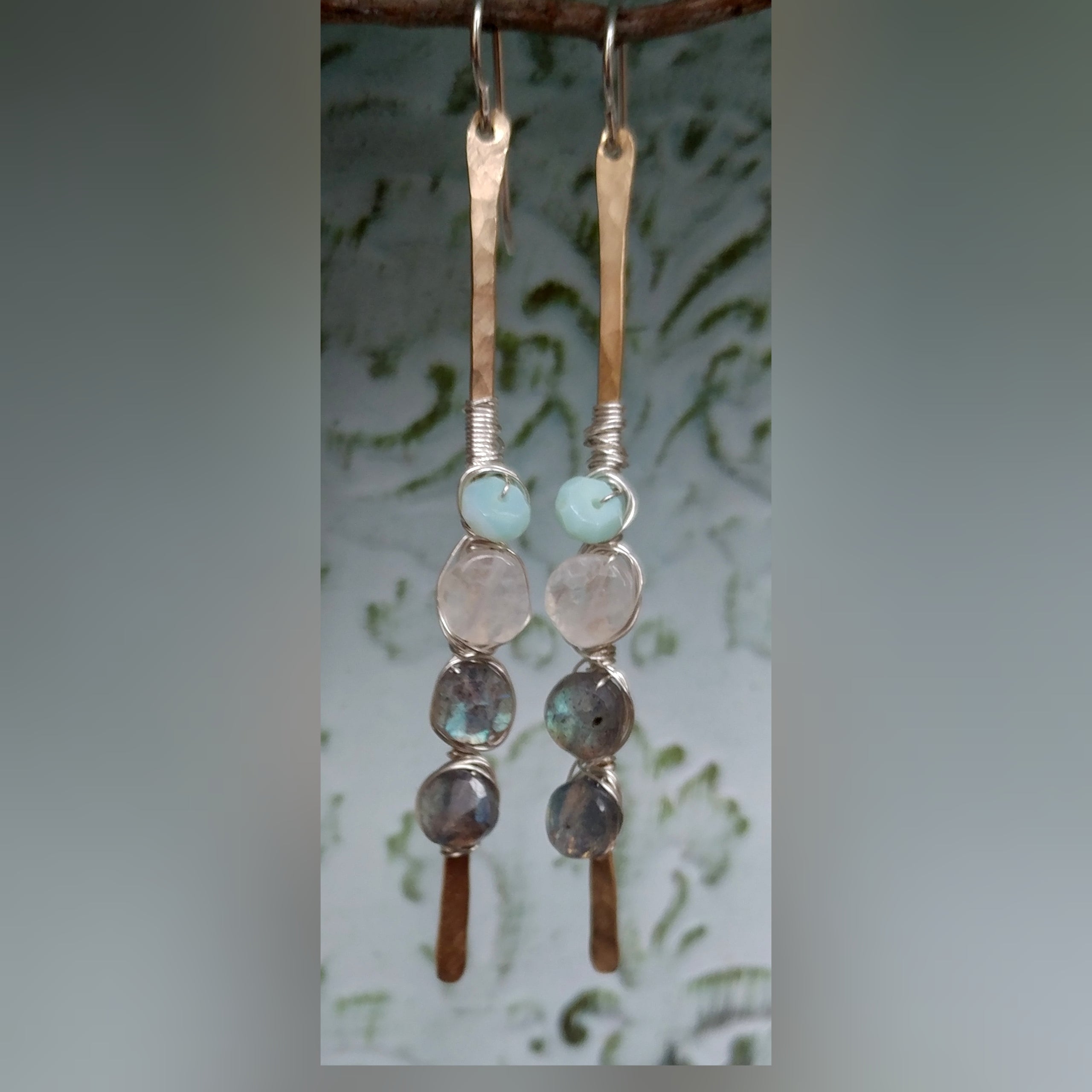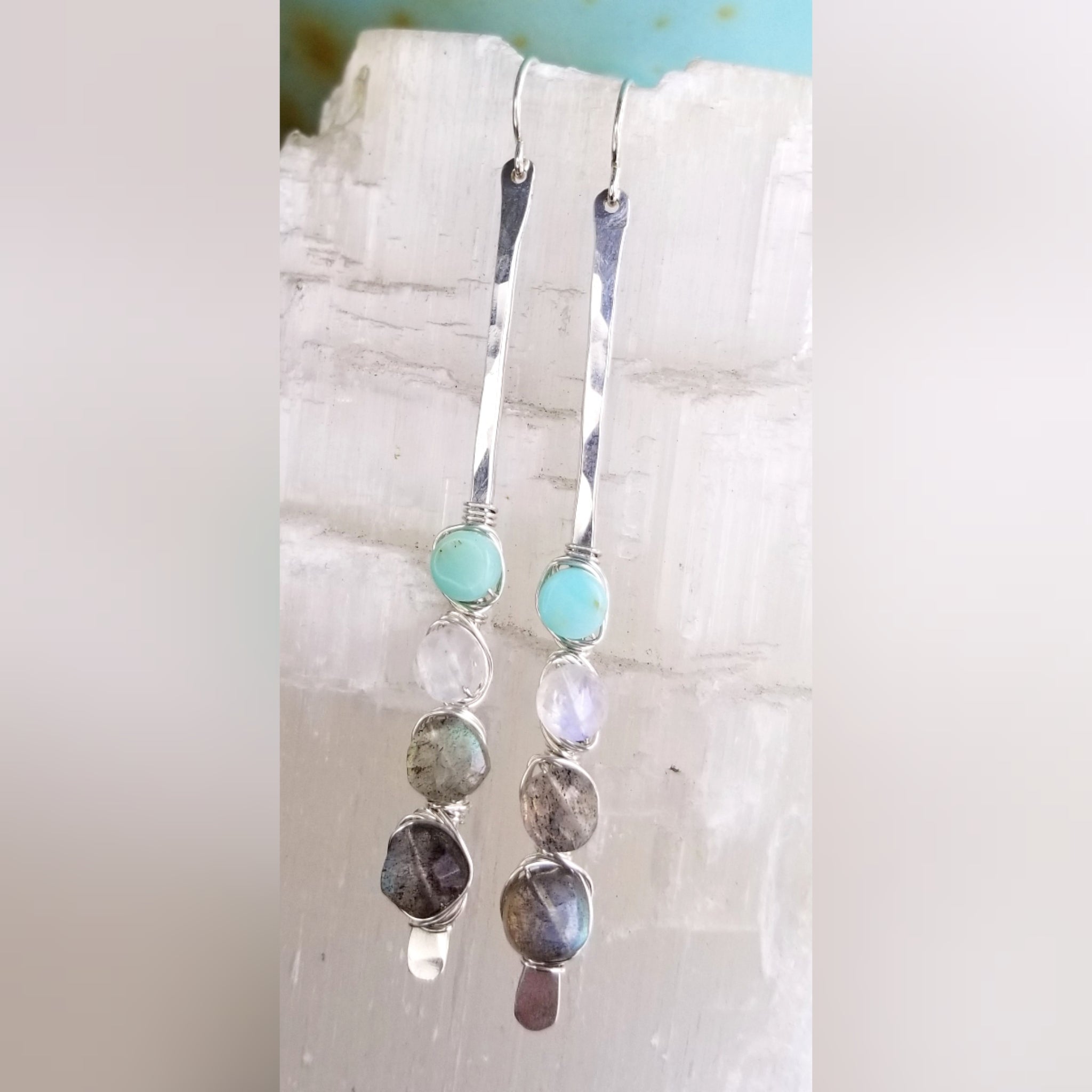 Stunning Minimalist Hammered thin bar earrings embellished with Peruvian Opal, Moonstone, Labradorite
