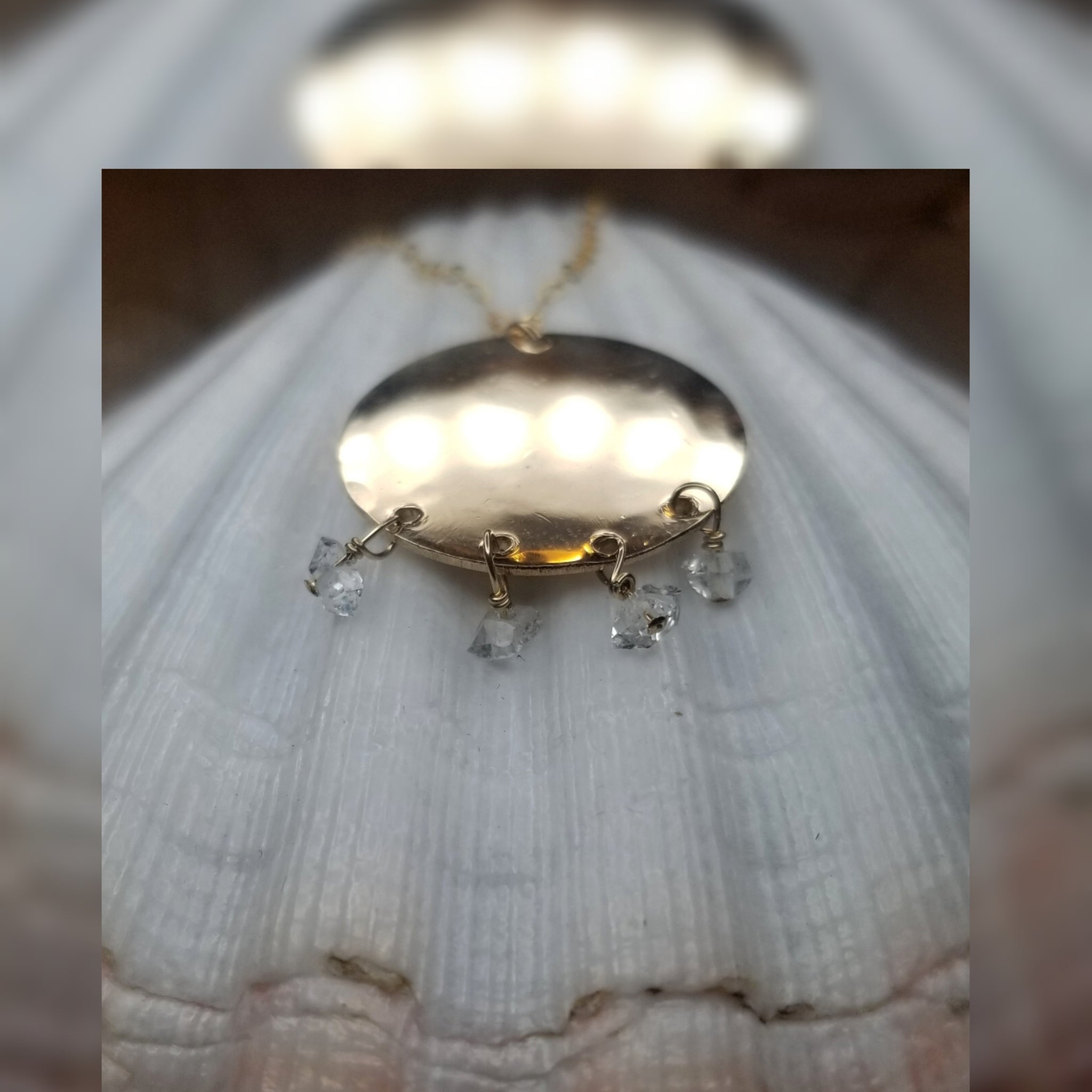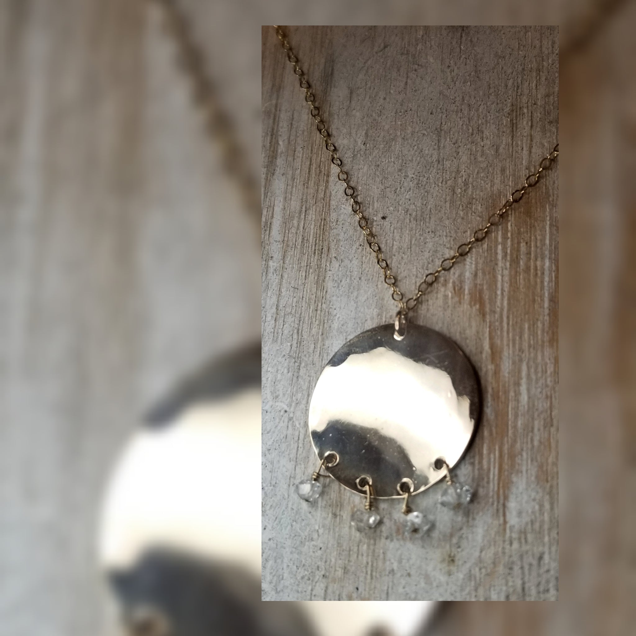 Beautiful 22mm large hammered coin/ disc adorned in Tiny Herkimer diamonds. Great necklace for layering or to be worn alone