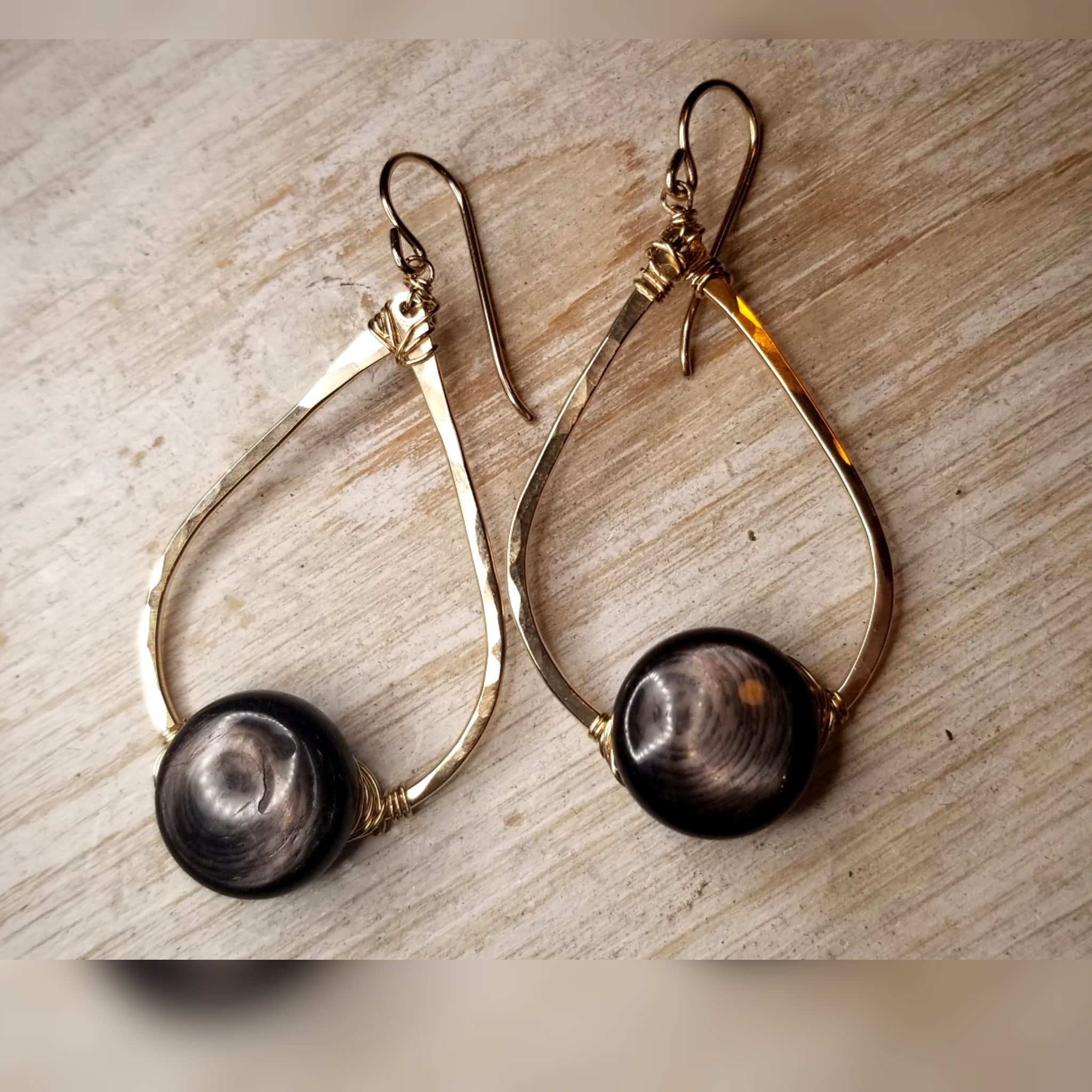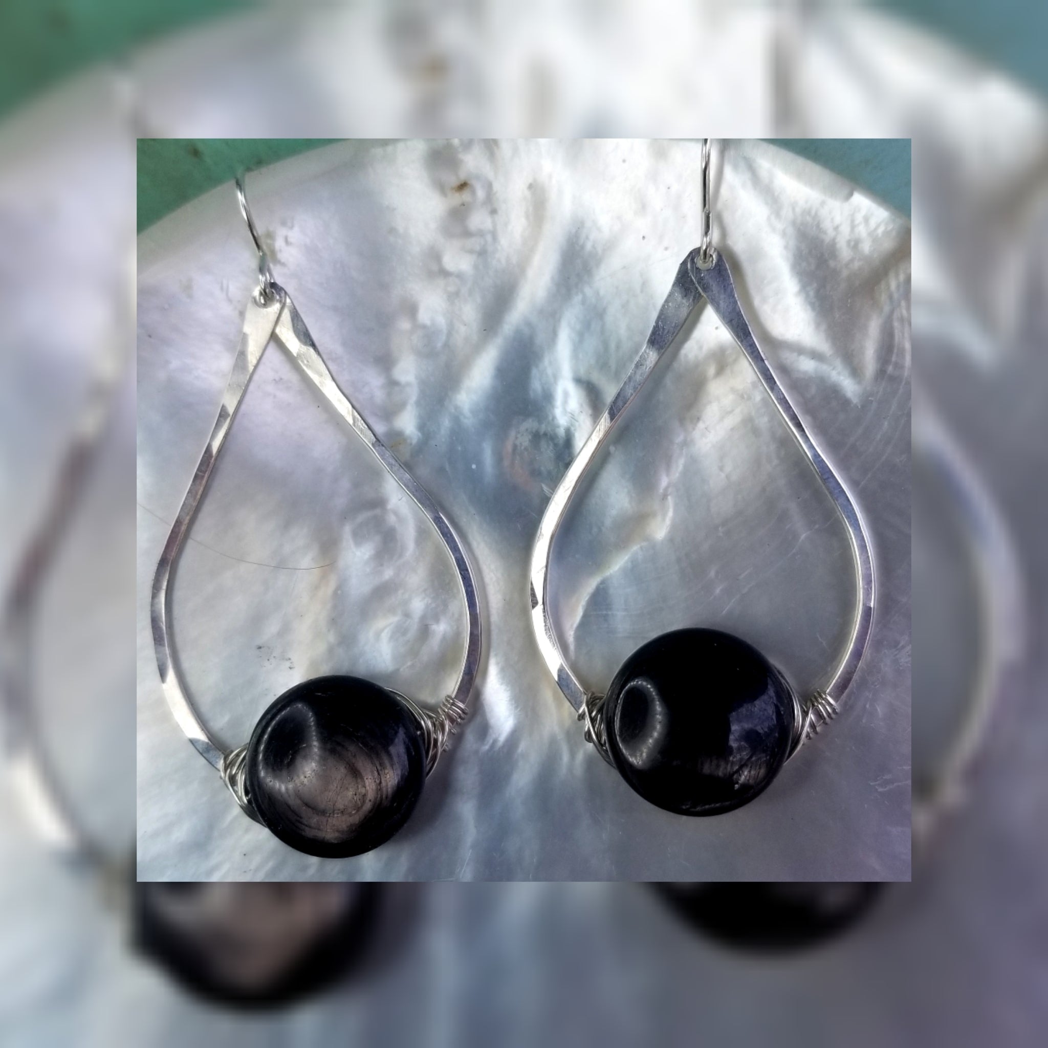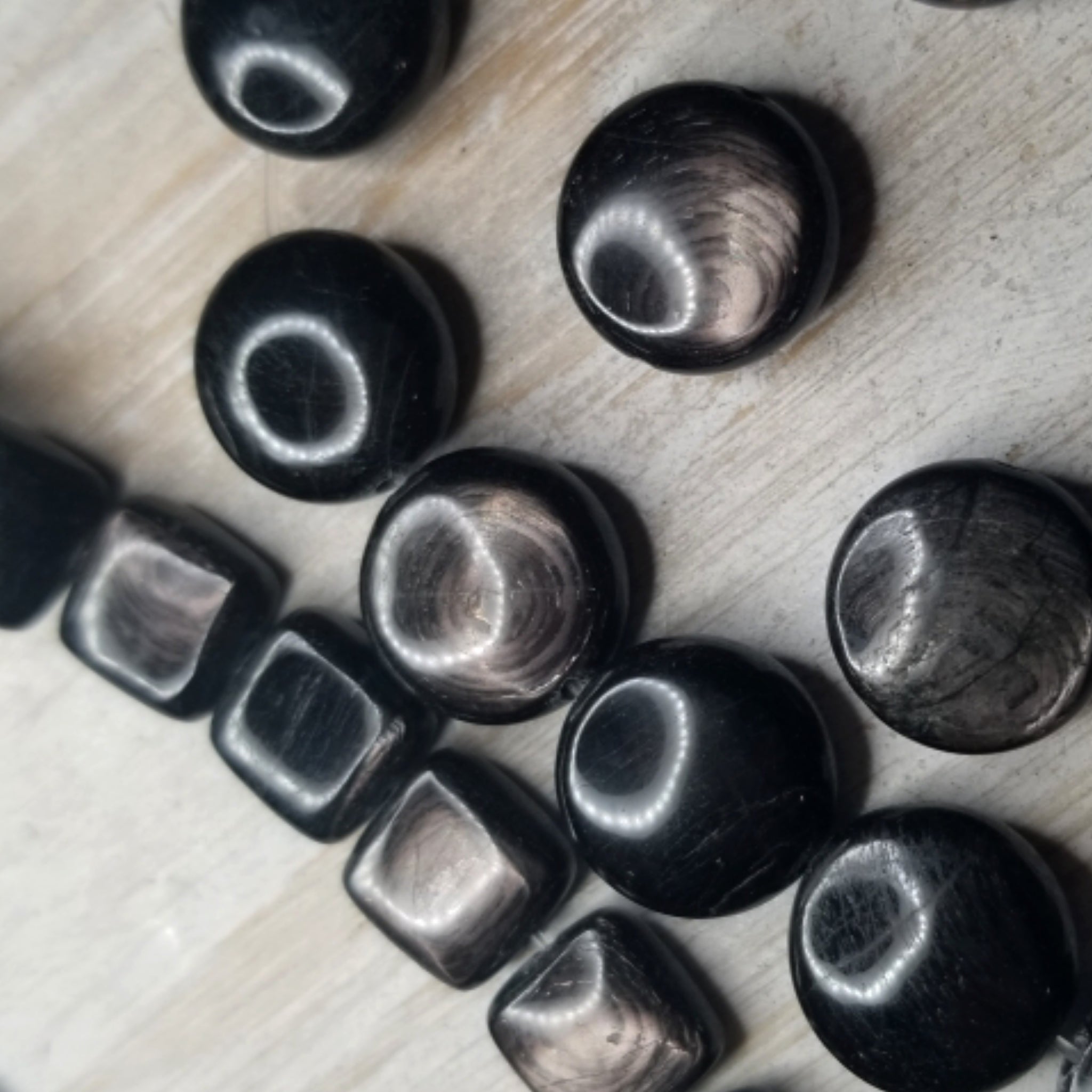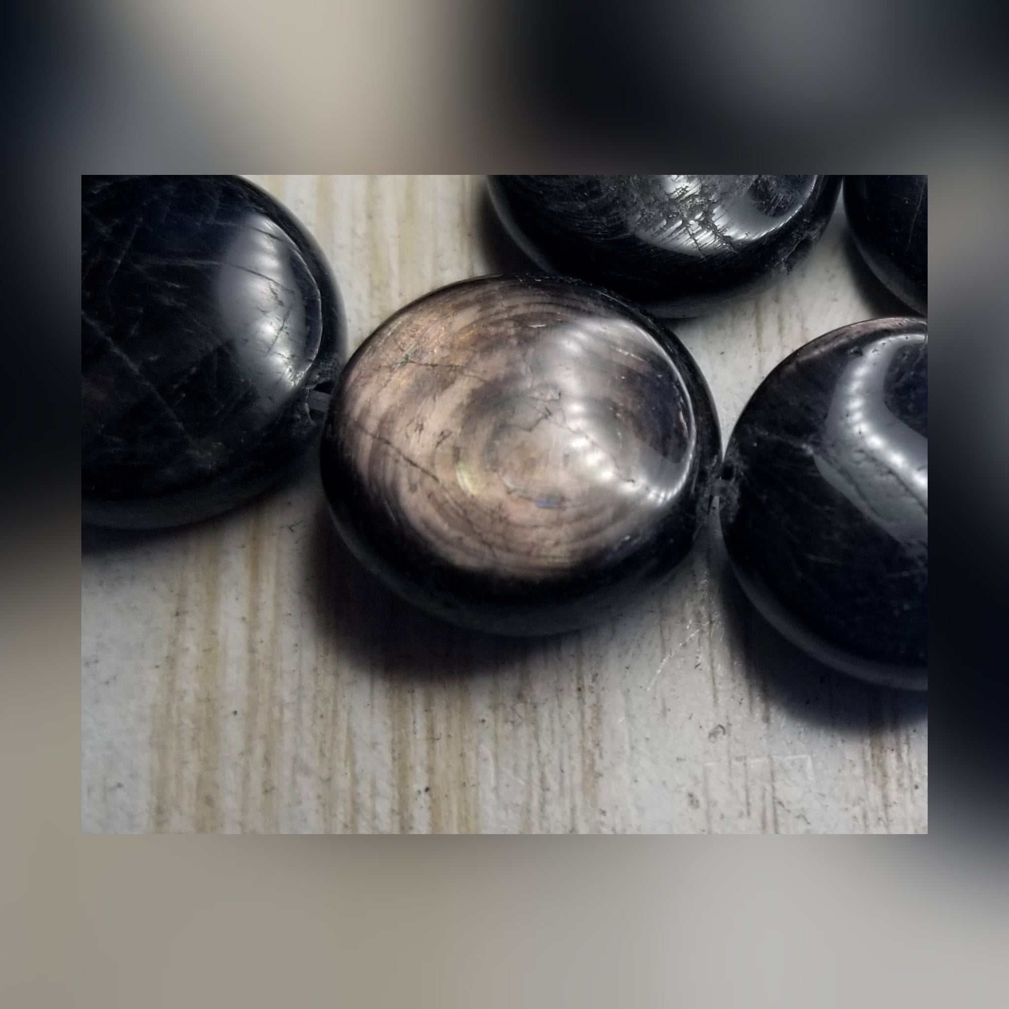 Hypersthene is a beautiful stone… for you ladies who gravitate towards black stones this one will have your heart! At different angles you will see swirls of brownish~gray colors inside. In some light the color has a bit of a copper glow to it. In some of the stones a slight purple can appear.