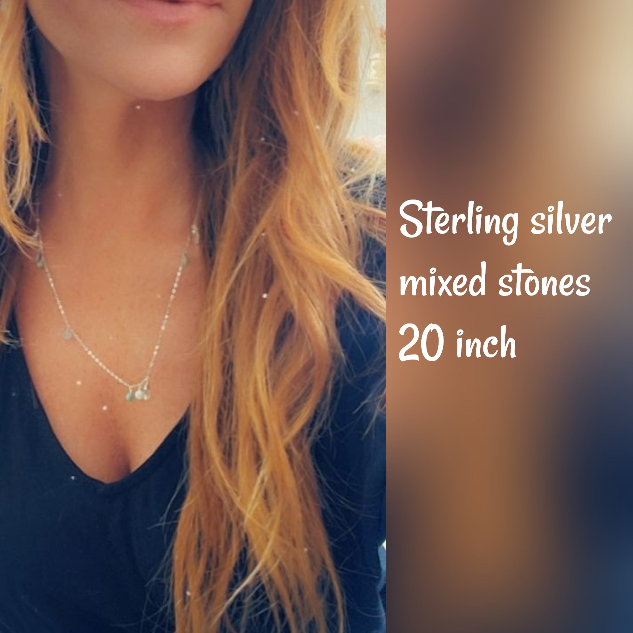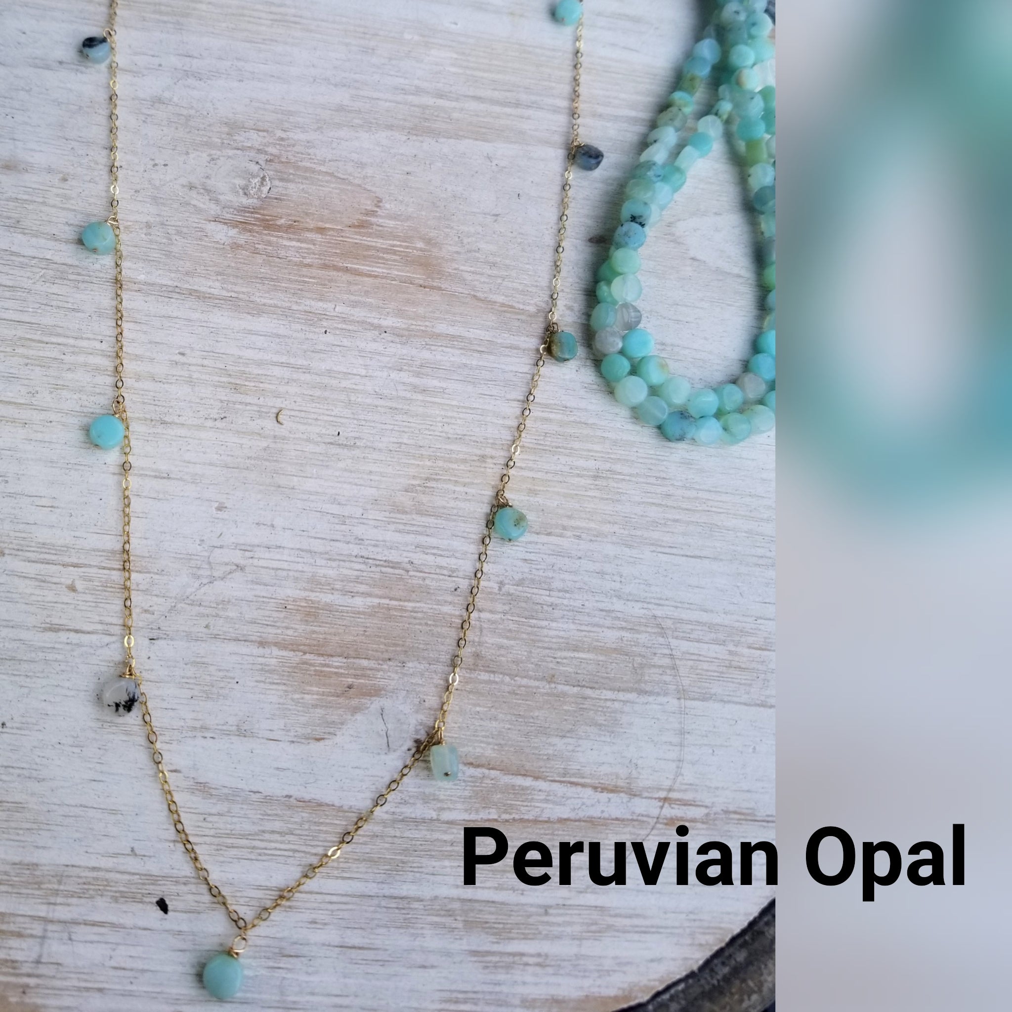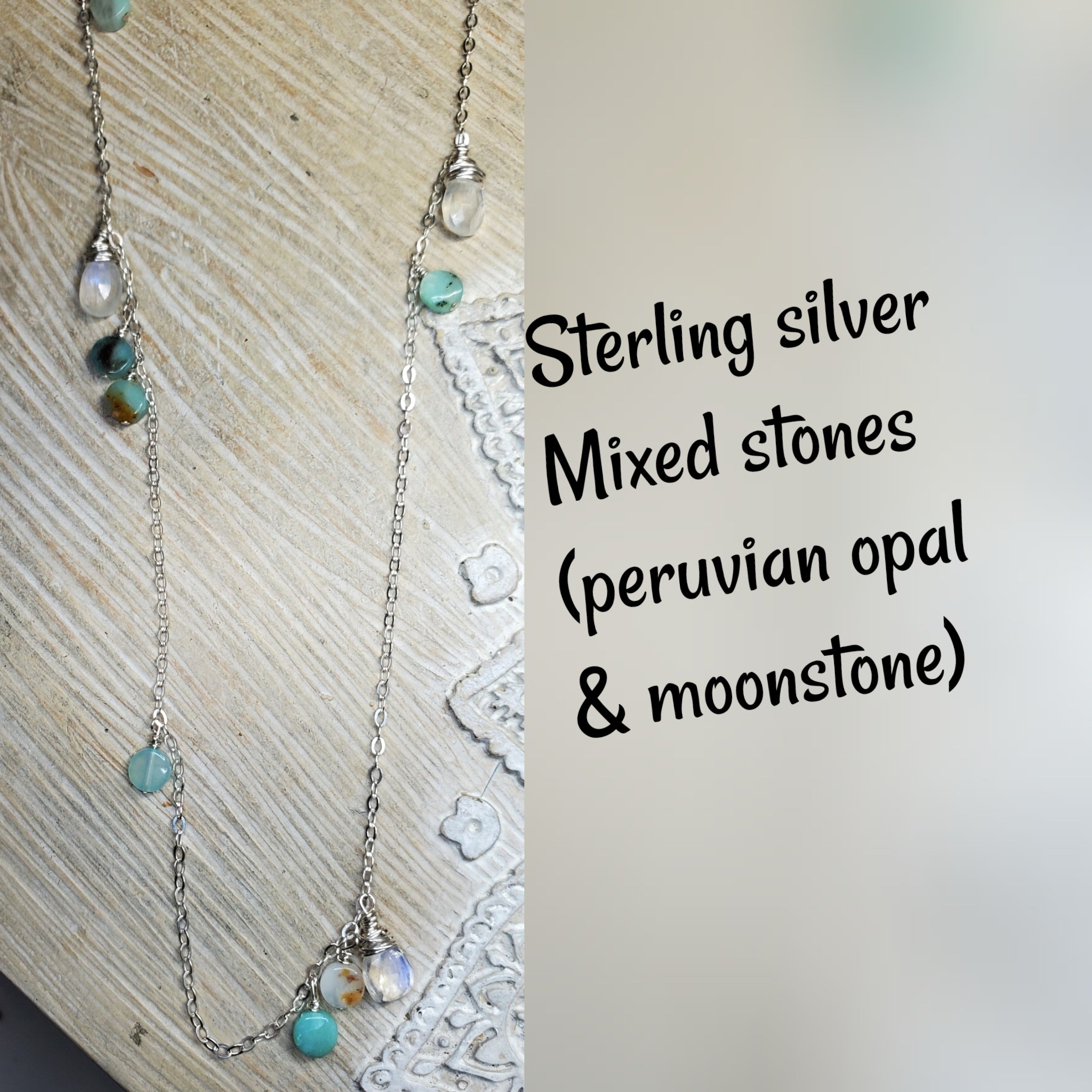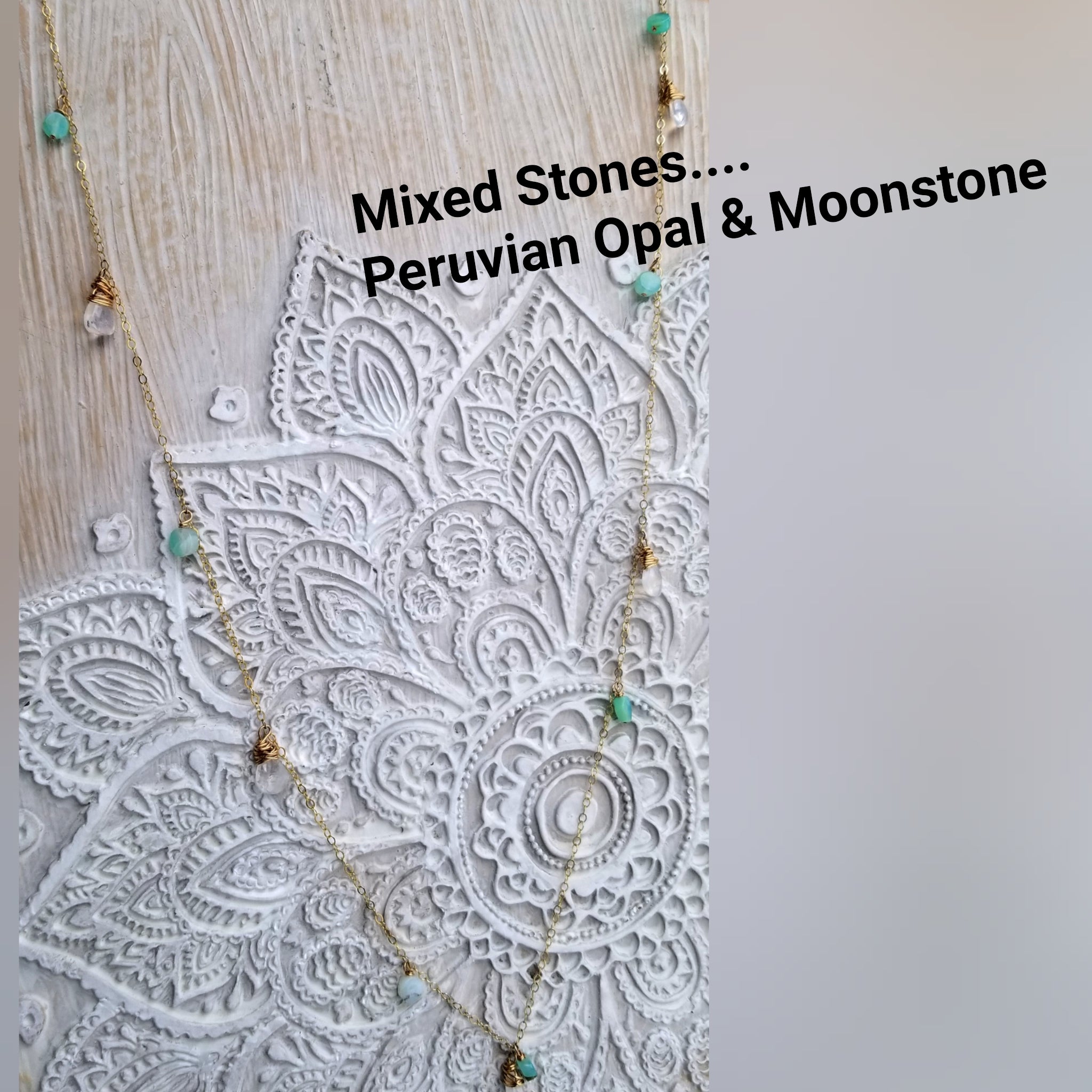 Coins, Peruvian Opal (which has multiple shades as shown in photo) and Mixed Stones (which is a mix of Peruvian Opal & Moonstone briolettes)