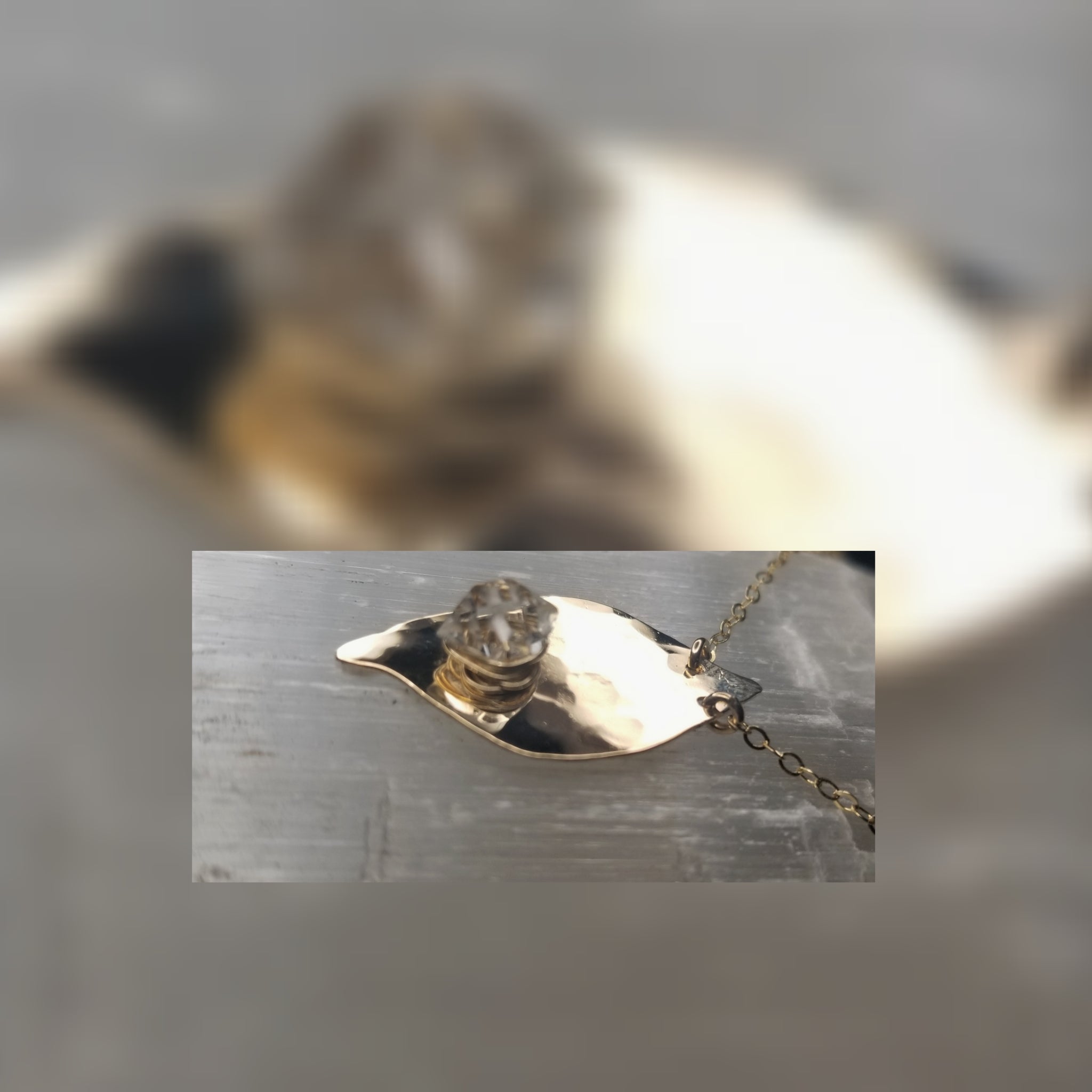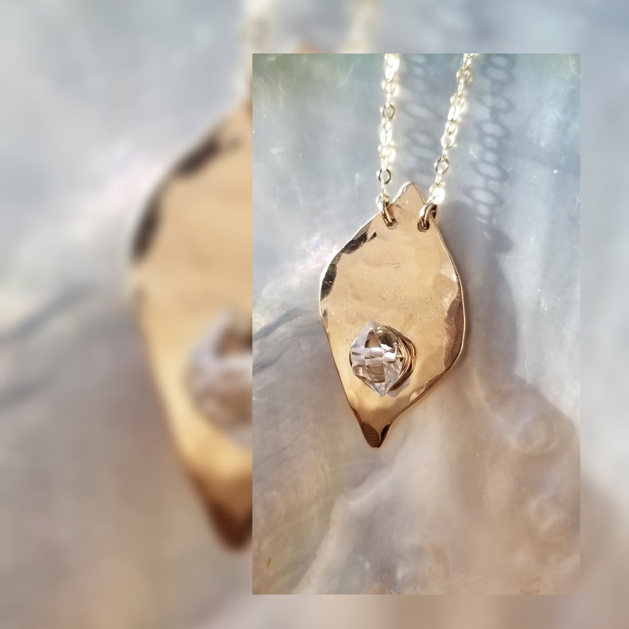 Hand Cut this design out of a sheet of metal….. wrapped into it is a Herkimer Diamond