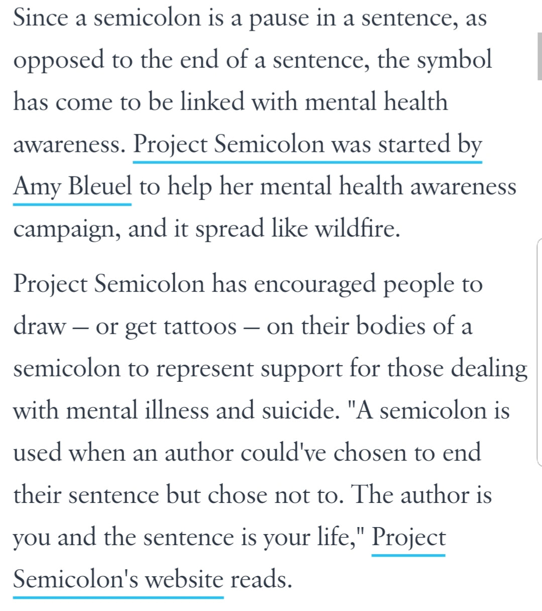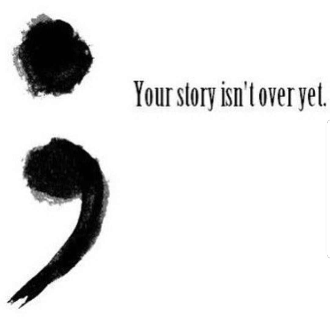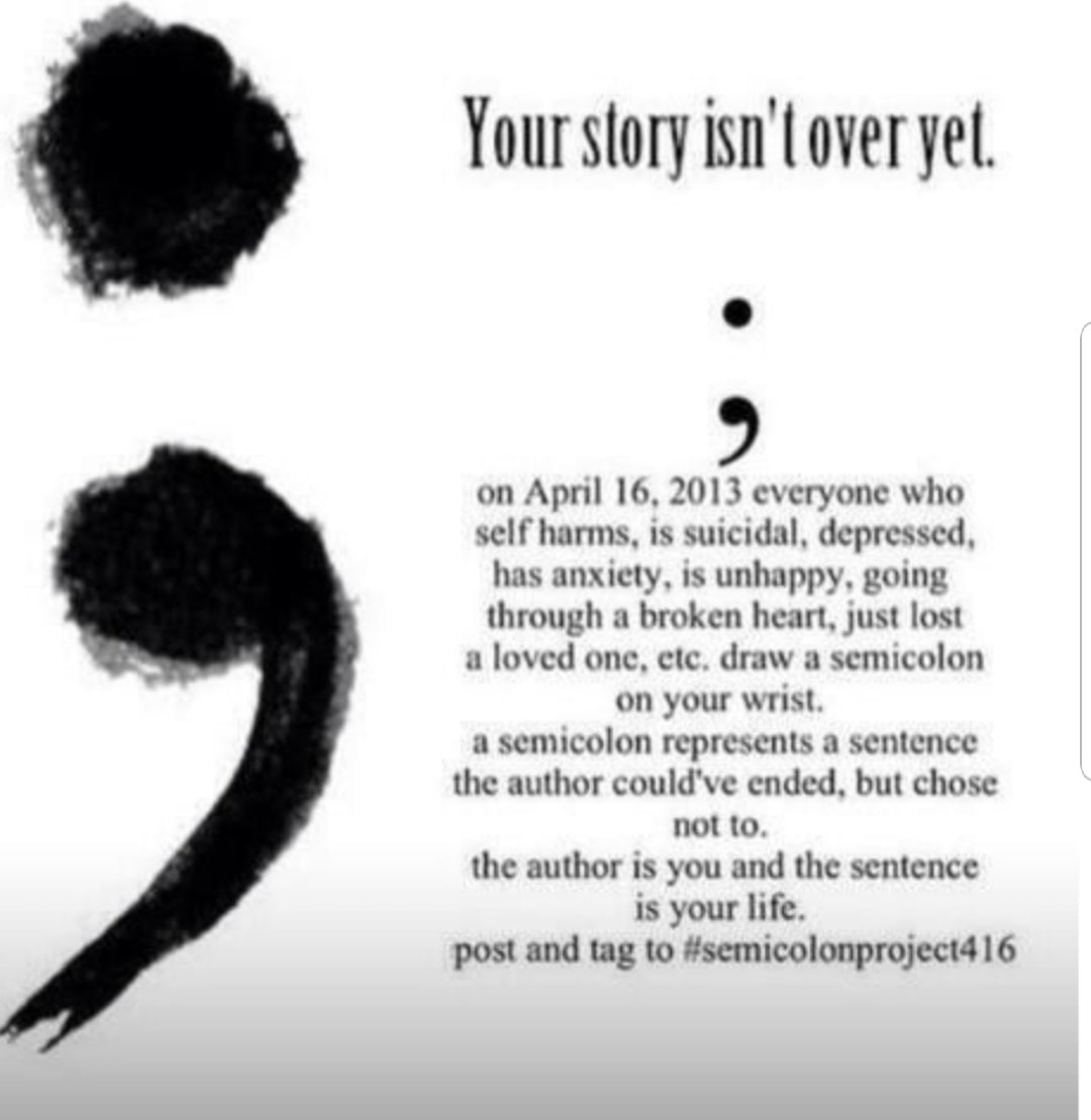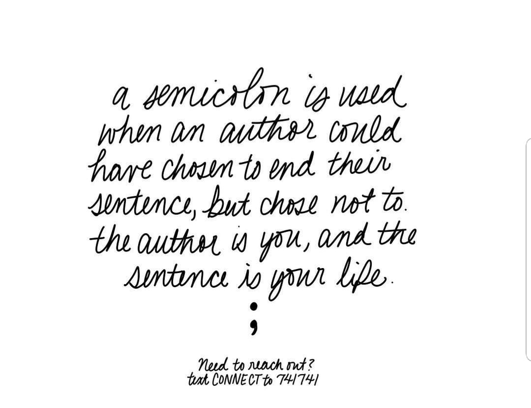 Suicide prevention & awareness. The semicolon Symbol is used when an Author could have chosen to end their sentence but chose not to. It represents a pause. You are the author of your own story and can choose to continue on.