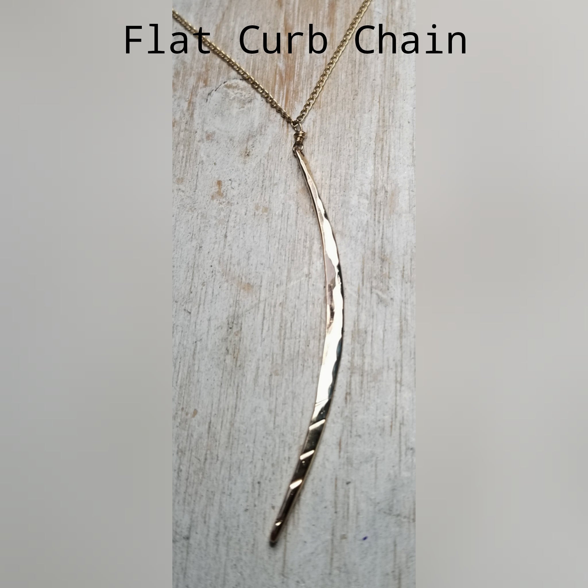 Simple minimalist design with a beautiful high polished finish to catch the light. This necklace is made with the regular chain but shown in the photo with 2 different chains just to show the difference and the necklace being worn is with the Flat Curb chain upgrade option…